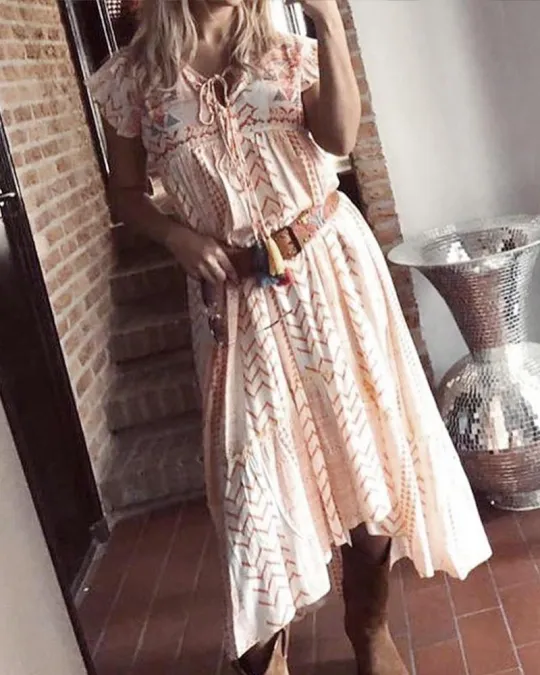 Printed V Neck Ruffle Hem Sleeveless Tassel Design Casual Loose Midi Dress